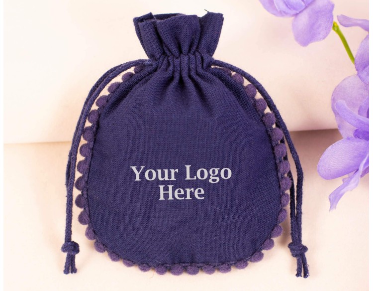 100 Blue Cotton Drawstring Pouches For Jewelry Packaging With Brand Logo Print, Jewelry Bags are lightweight and portable accessories that have a variety of uses. These drawstring bags look very stylish with their round pompom design so they can be used for gift packaging. Not only this, Cotton Drawstring Pouches are perfect for organizing and storing your precious jewelry for a long time. They are customizable so you can get your brand logo or any message printed on the bags.