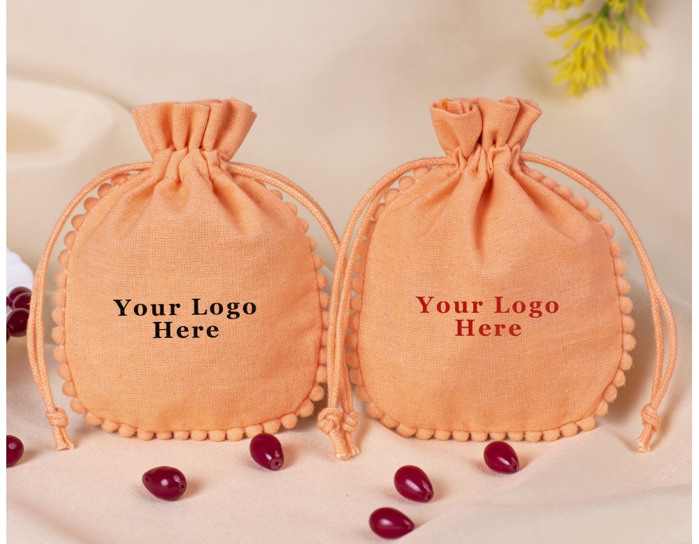 100 Light Orange Round PomPom Cotton Drawstring Pouches For Jewelry Packaging With Brand Logo Print, Designer Borders